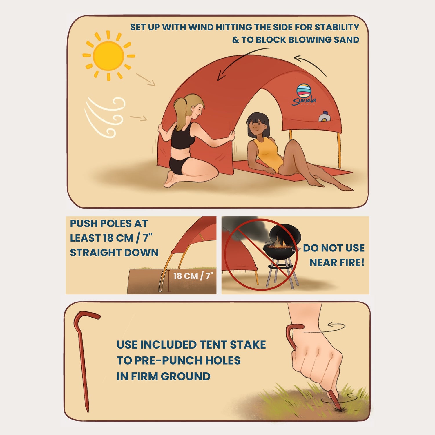 Simply push the poles into the sand (or grass) to establish your shade haven - a vibrant, airy and safe space to relax with friends and family, with easy-access pockets for all your stuff. Quick & easy one-person set up makes it a breeze to enjoy the great outdoors without getting beat up by the sun. The open design ensures those around you won't miss any of the view, while you enjoy maximum ventilation & airflow.